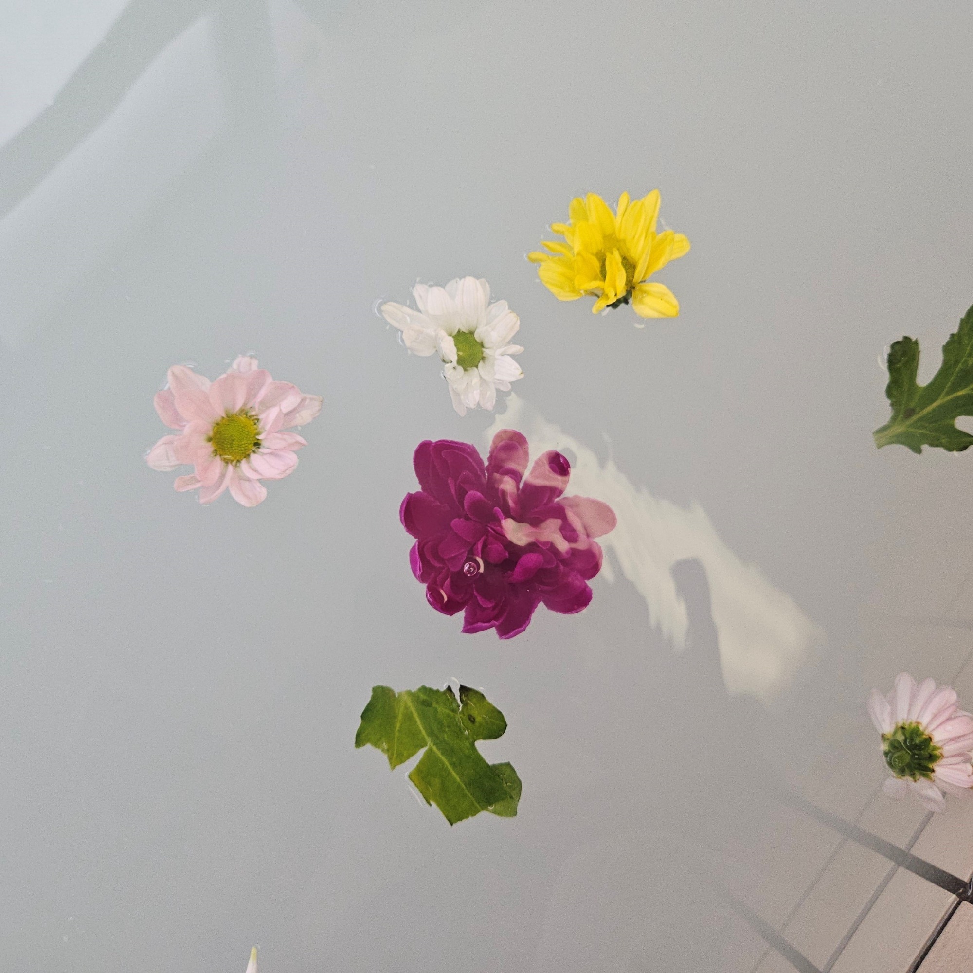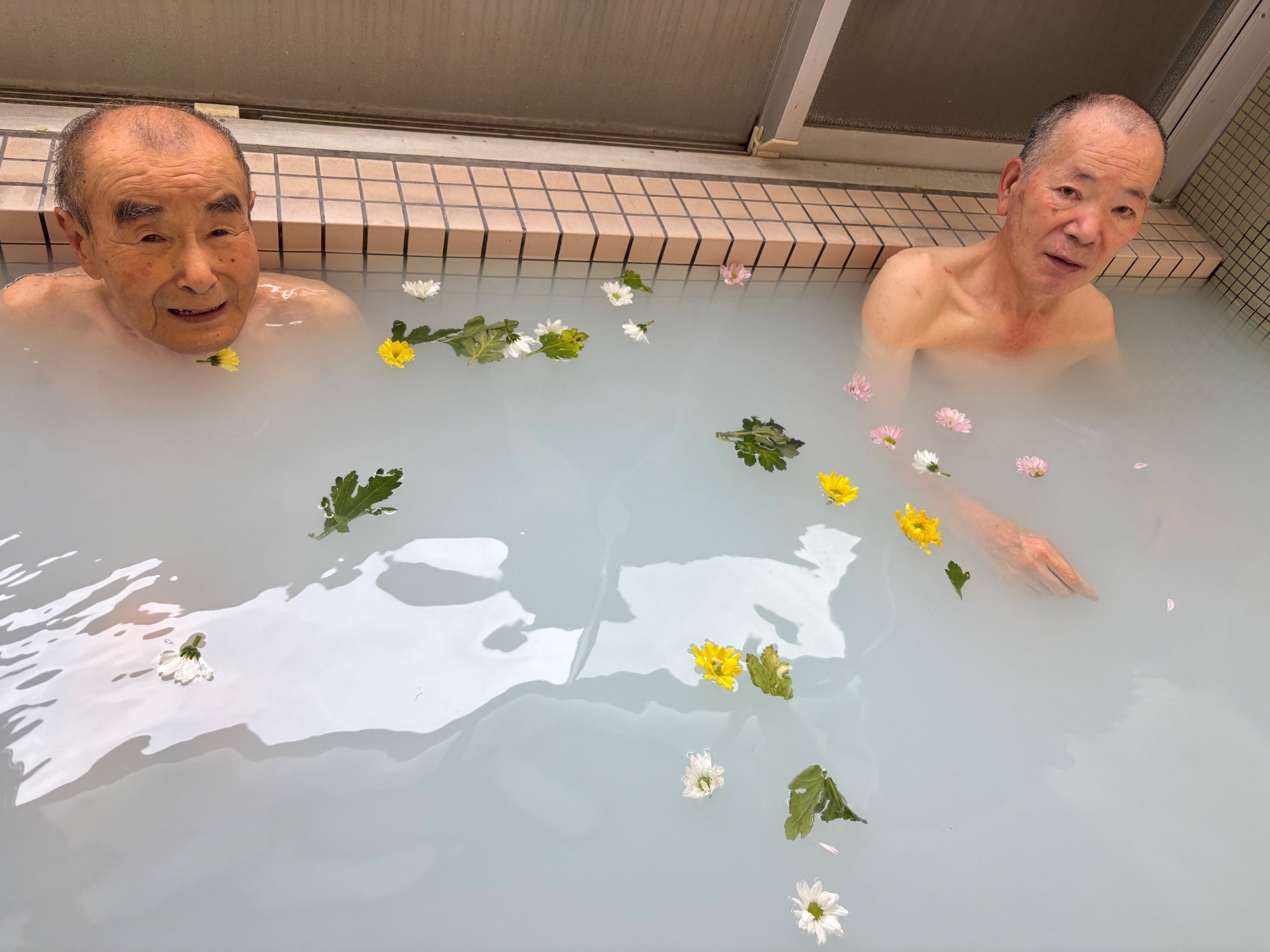 朝夕の風に秋の涼しさを感じる季節となりました。皆さまいかがお過ごしでしょうか。日中はまだ暑さが残るものの、秋の深まりを感じる瞬間も増えてきました。今月は季節湯として「菊湯」を楽しんでいただきました。菊の香りに包まれたお湯に浸かりながら、ゆったりとした時間を過ごされ、心も体もほぐれるひとときとなりました。湯上りには、手作りの「カボスジュース」を提供いたしました。「さっぱりしておいしいね」と喜んでいただけました。また敬老会に向けて、皆さまと一緒に飾りつけの準備をしました。季節の変わり目で体調を崩しやすい時期ですが、これからも楽しい活動を通じて元気に過ごしていきましょう
