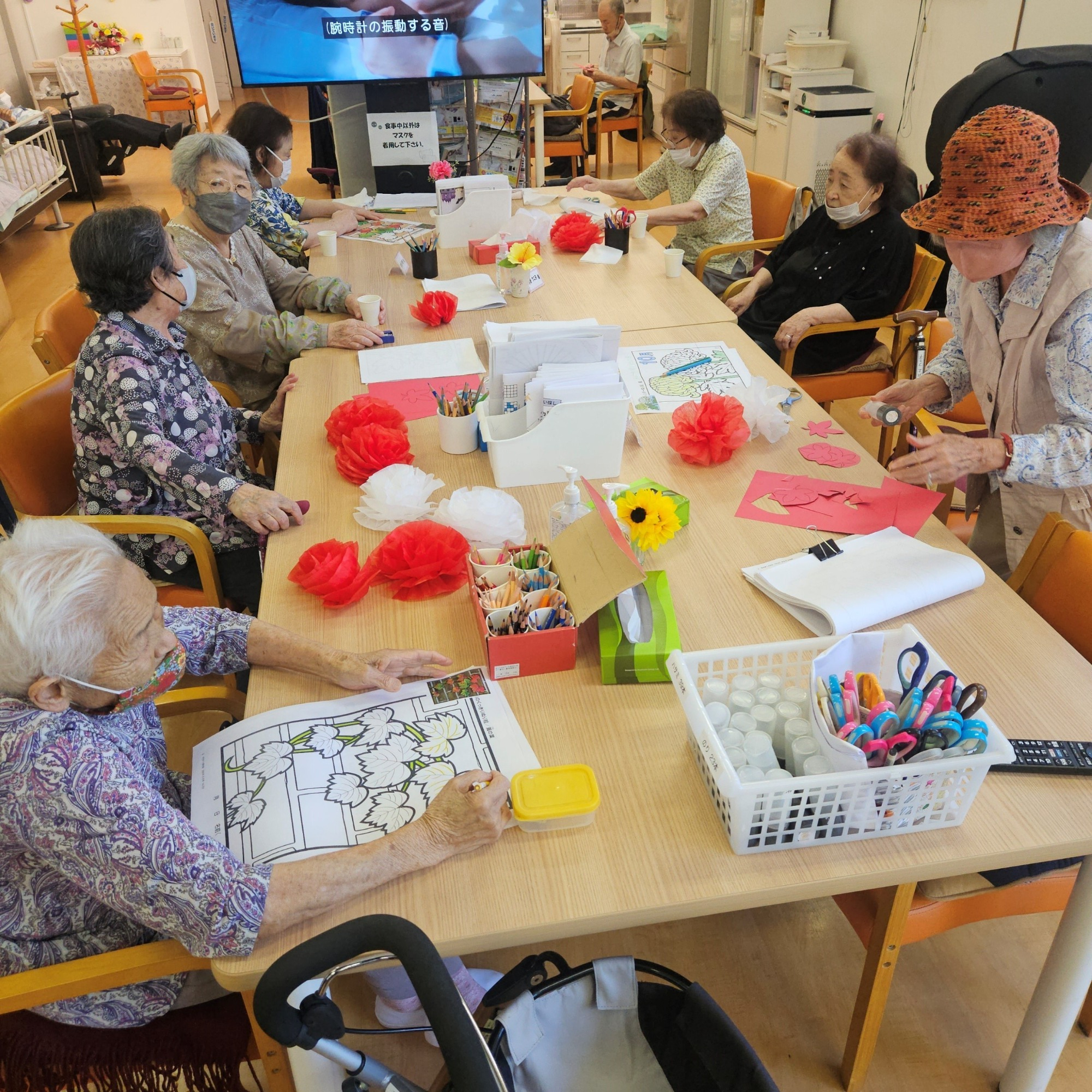 夏の日差しが日に日に強くなり、本格的な暑さが感じられる季節となりました。皆さまいかがお過ごしでしょうか? 先月は七夕に向けて笹飾り制作を行いました。願い事を書いた短冊や飾りが涼しげに風に揺れ、季節の風情を感じさせてくれます。「健康で過ごせますように」 「宝くじが当たりますように」など心のこもった願い事がたくさん集まりました。また、野菜やお花の苗植えにも取り組みました。一つひとつ丁寧に植えた苗が、少しずつ育っていく様子を皆さまと一緒に見守っています。